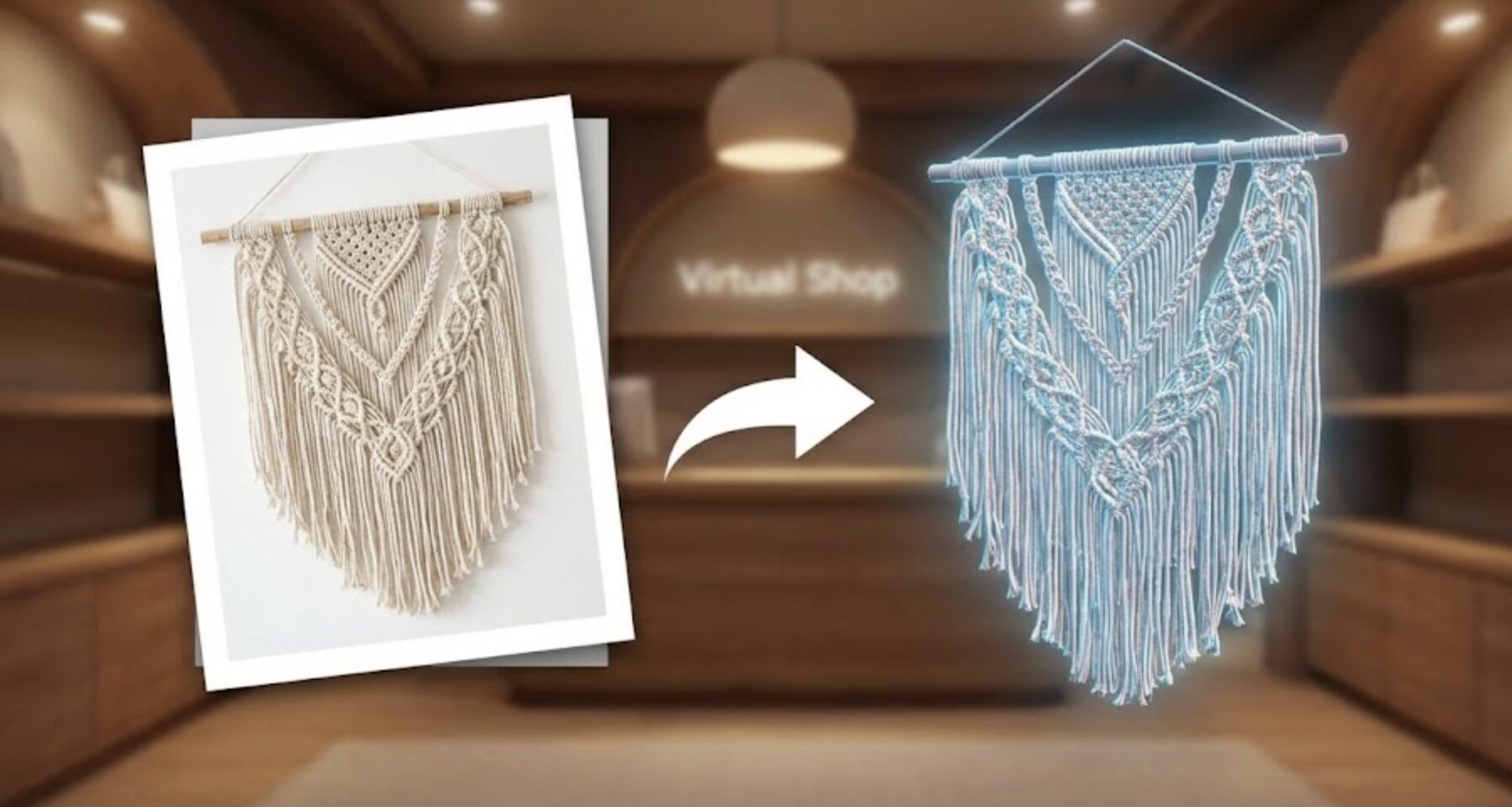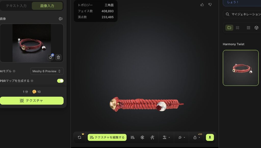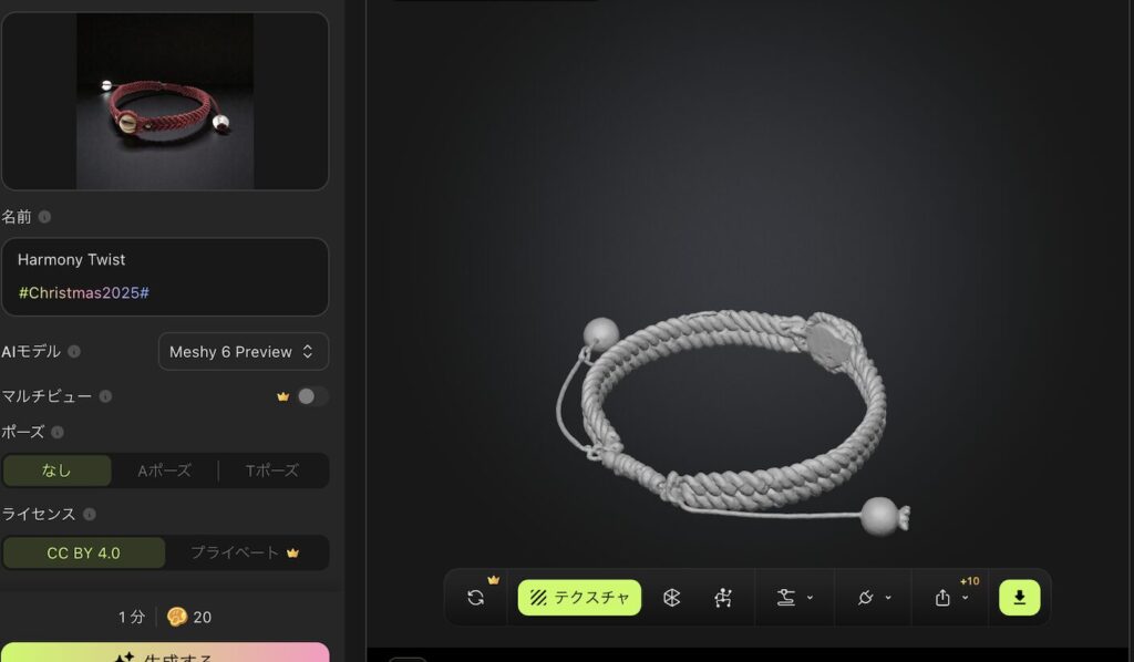 写真1枚からAIが裏側まで予測して生成してくれます。マクラメ編みなどの複雑な質感も、期待以上のクオリティで立体化されました。